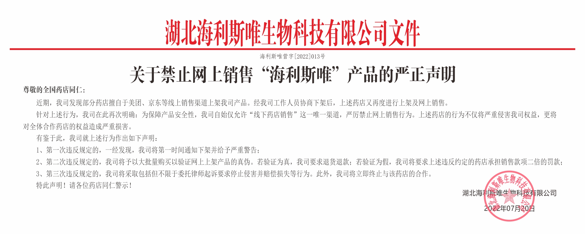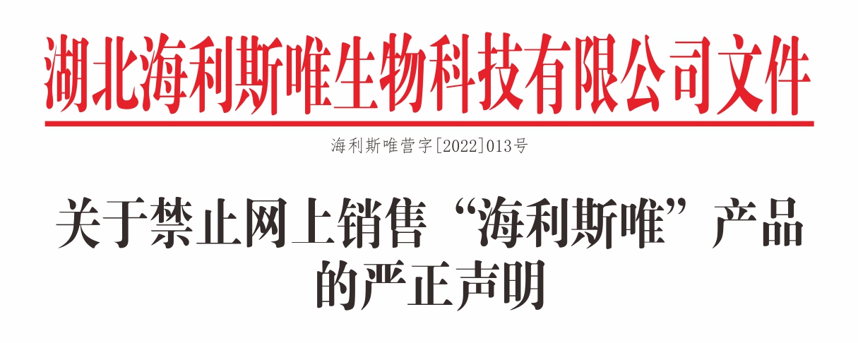 關于禁止網(wǎng)上銷售"海利斯唯"產(chǎn)品的嚴正聲明